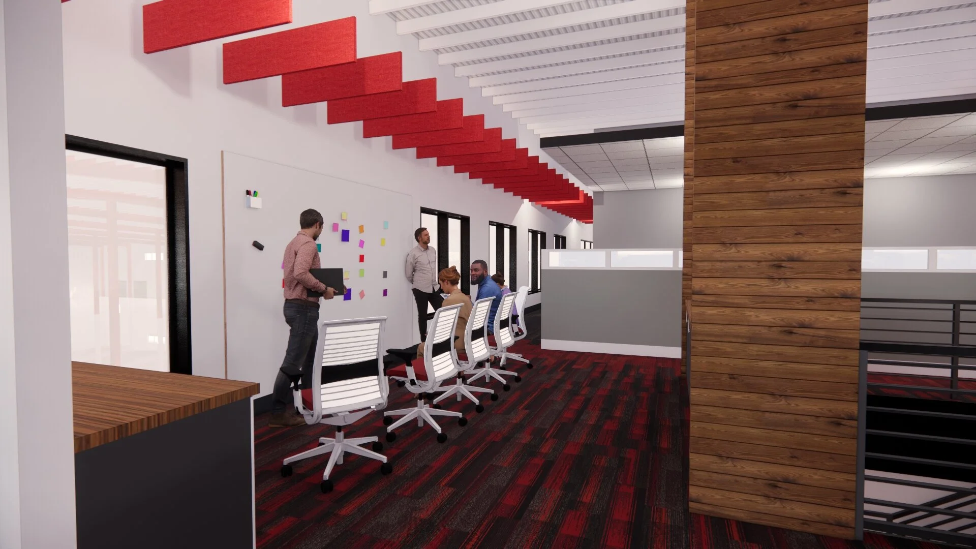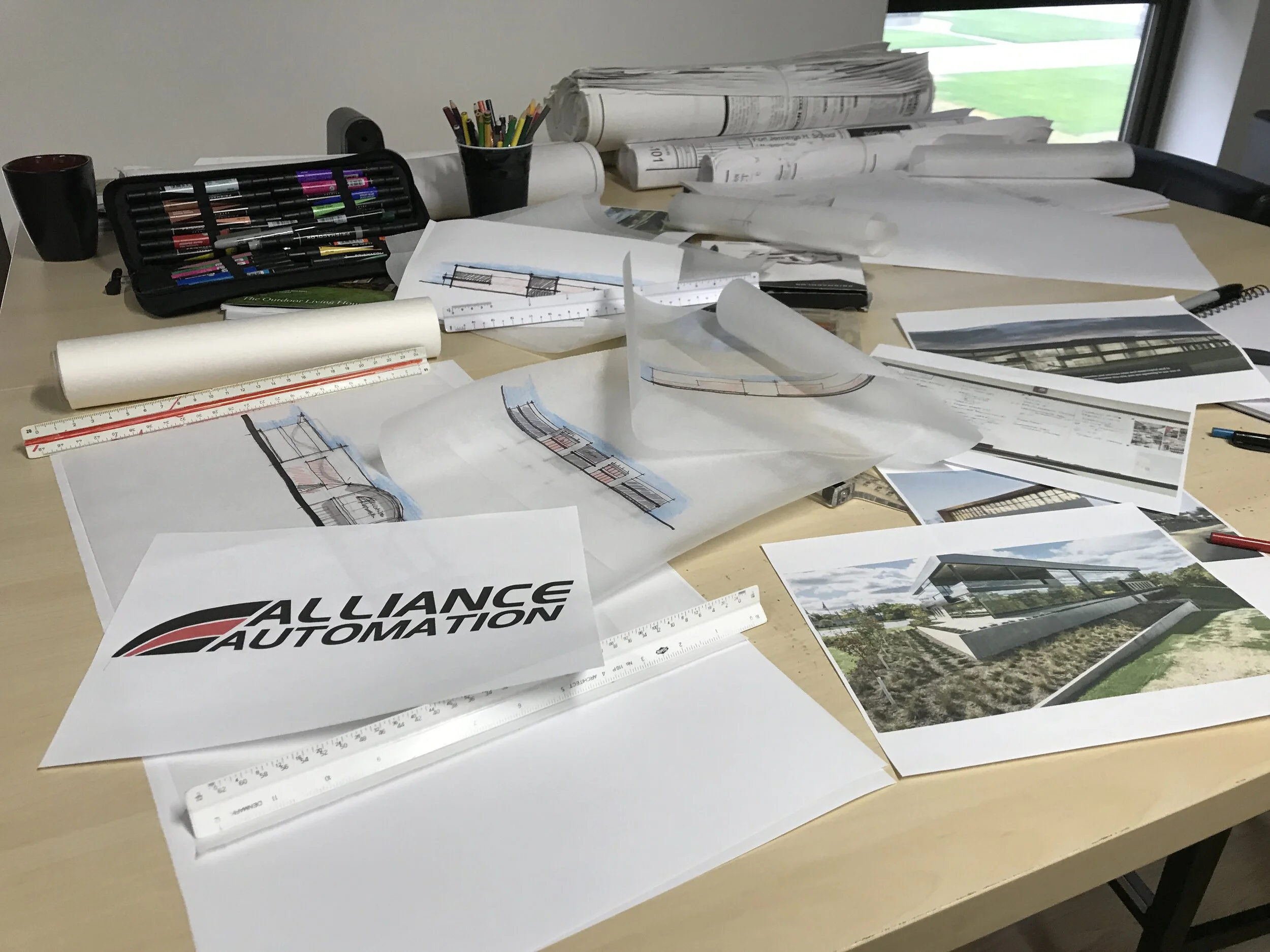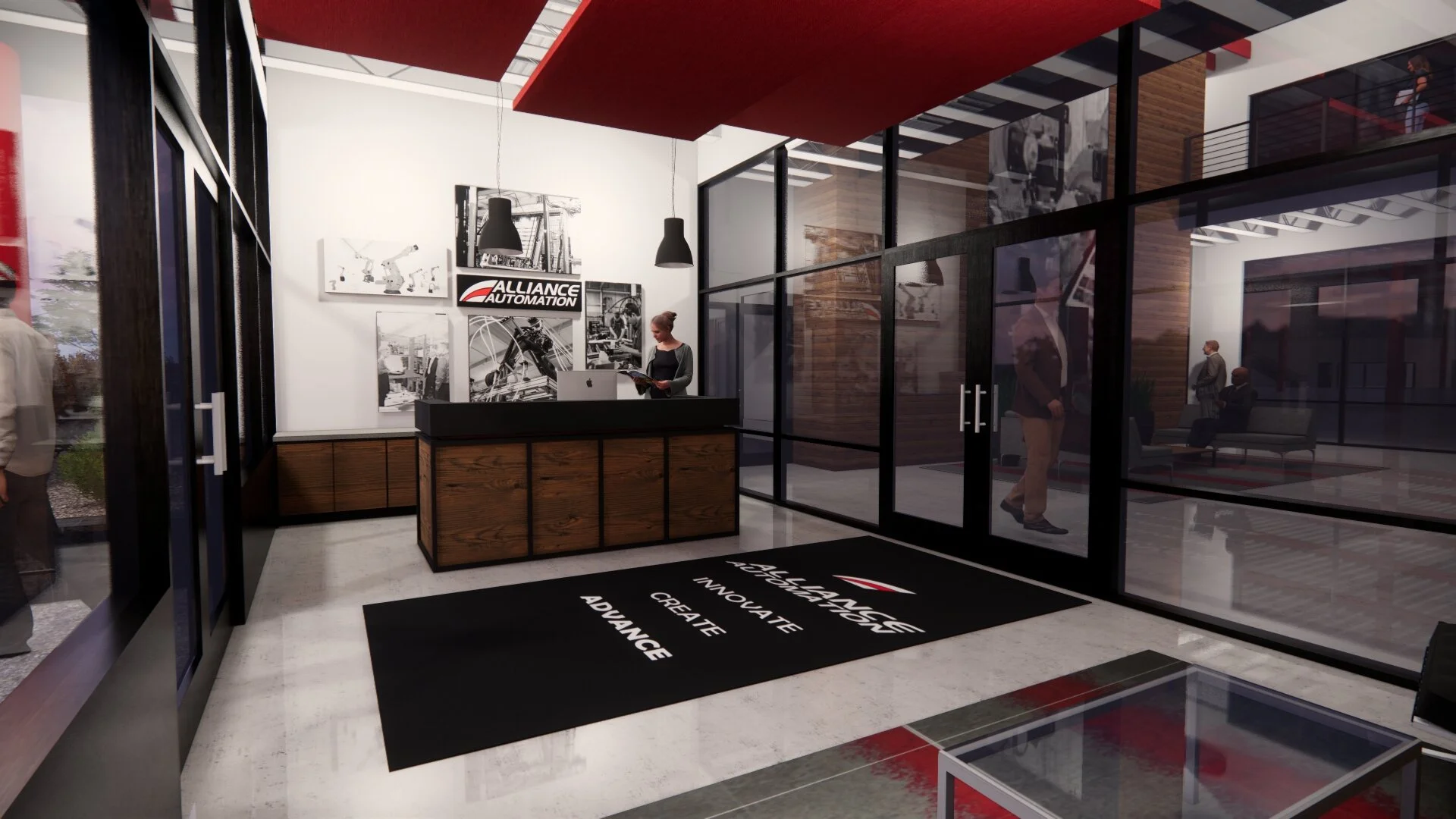 Our team was inspired by a sports arena. The concourse tells the team’s story and elevates excitement before you enter the arena to watch the athletes. Alliance Automation’s atrium is their branded concourse, but the real attraction is the shop floor where the talented people design and build robotic automation systems.